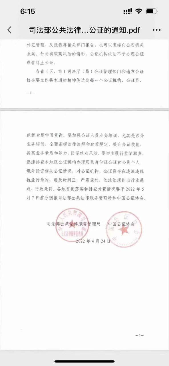 据悉,网上曝光了一份由“中国司法部公共法律服务管理局”和“中国公证协会”于2022年4月24日发布的通知,这份通知表示,公证机构受理公民个人用于境外投资开立银行账户、股票账户、买卖不动产、设立公司的委托书公证,居民身份证公证,中国护照公证及其他相关公证,应严格按照国家规定,采取响应的当事人尽职调查。了解当事人身份、业务关系目的和性质,并根据当事人身份、业务关系或者交易的风险程度,要求当事人提交外汇管理等部门的核准文件或者其在境外有工作经历或合法收入来源等相关印证材料,不得采取变通方式办理公证。