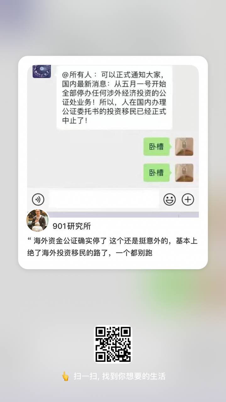 4月30日,据《时刻新闻》报道,最近在网络上疯传一份中国司法部公证处发布的文件,文件指出,从5月1日开始,中国国内全面停办任何涉外经济投资的公证处业务,人在中国国内办理公证委托书的投资移民已经正式中止了。有网友“901研究所”分析指出:海外资金公证意外的暂停了,这一举动基本上绝了海外投资移民的路。