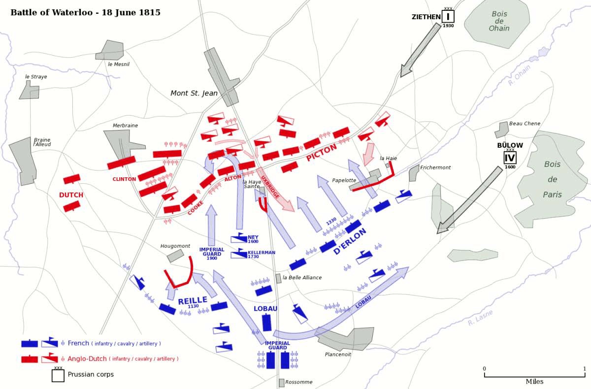 午后一时,正当拿破仑想以主力猛攻英军中段阵地时,忽然获得布吕歇尔集结的普军来援英军的消息,拿破仑被迫从总预备队中抽出两个骑兵师阻滞普军。同时,火速传令原负责追击普军的格鲁希立即回师支援滑铁卢,一面猛攻中段。英军顽强抵抗,双方伤亡很大。下午6时,拿破仑占领了中段的圣拉埃村。由于争夺战异常激烈,英军开始支持不住,法军也难以再扩大战果,双方都等待援兵。最后,英军盼来了布吕歇尔的3万援兵,而法军的援军却没来,于是战局急转直下,拿破仑腹背受敌,最后大败。在这个战役中,法军损失3.2万人,联军损失2.3万千人。滑铁卢战役后,联军很快攻占巴黎,拿破仑再次退位,被放逐到大西洋中的圣赫勒拿岛。