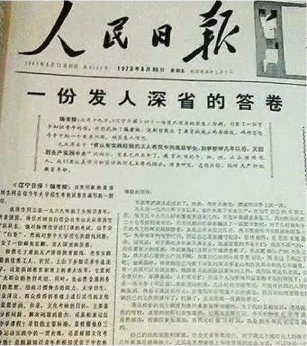 1973年7月19日,《辽宁日报》头版头条以《一份发人深省的答卷》为题,刊登辽宁省兴城县白塔公社下乡知识青年、生产队长张铁生的一封信,张的信写在辽宁省大学入学考试的物理化学试卷背后。