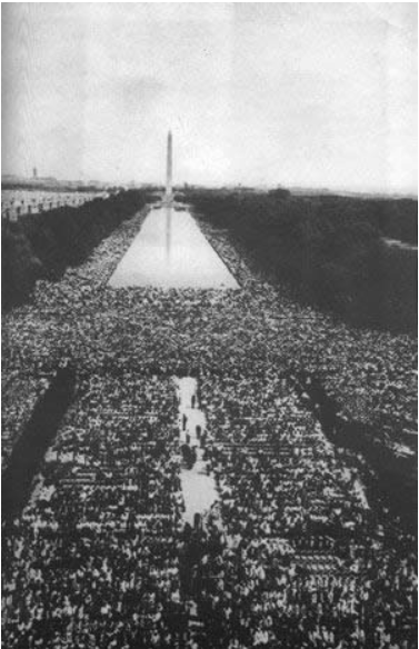 1963年8月28日,来自美国50个州的20多万黑人以及白人举行了华盛顿有史以来规模最大的示威。上午11时,游行队伍从华盛顿纪念碑出发,分成两路纵队,行进到林肯纪念堂。马丁-路德-金、菲利普-伦道夫等黑人领袖向示威群众发表演说。