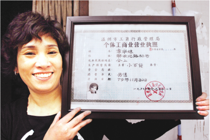 1980年12月11日,19岁的温州姑娘章华妹从温州市工商行政管理局领到了一份特殊的营业执照——工商证字第10101号,她本人则成为了“中国第一个工商个体户”。