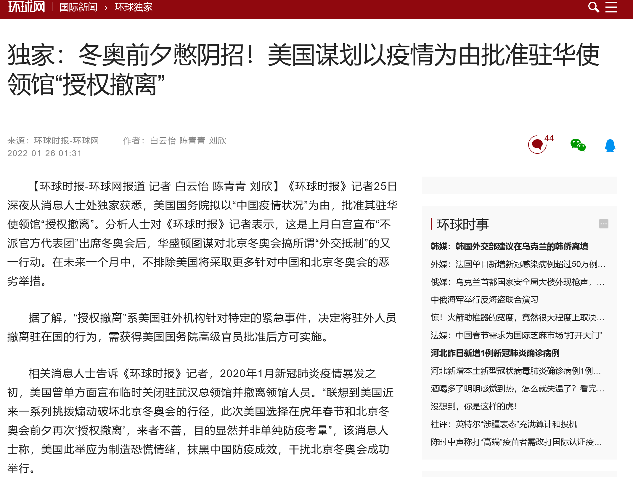 北京时间1月26日,据中共外宣媒体《环球时报》报道,《环球时报》记者25日深夜从消息人士处独家获悉,美国国务院拟以“中国疫情状况”为由,批准其驻华使领馆“授权撤离”。