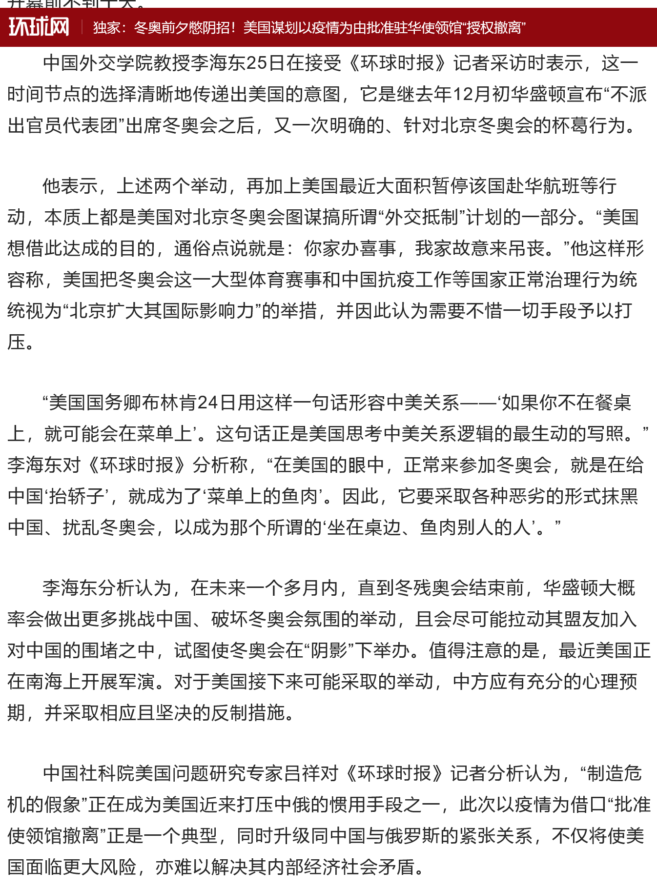 分析人士对《环球时报》记者表示,这是上月白宫宣布“不派官方代表团”出席冬奥会后,华盛顿图谋对北京冬奥会搞所谓“外交抵制”的又一行动。在未来一个月中,不排除美国将采取更多针对中国和北京冬奥会的恶劣举措。