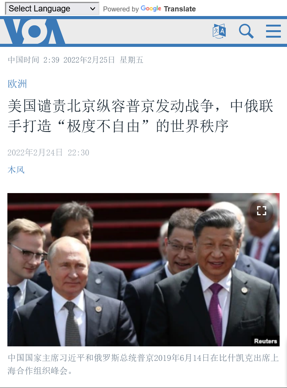 2月24日,据美国之音报道,在俄罗斯对乌克兰的战争爆发几个小时后,美国点名抨击中国纵容俄罗斯向乌克兰发动了这场大规模的战争。美国认为中俄联手要改变世界秩序,打造一个“极度不自由的”新秩序。