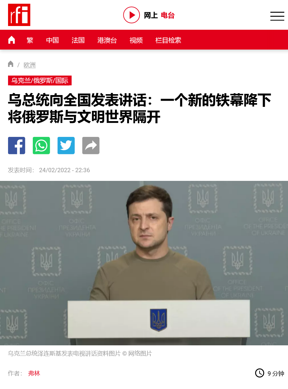 2月24日,据《法广》报道, 乌克兰总统泽连斯基(Volodymyr Zelensky)2月24日向全国发表了电视讲话。他在讲话中向俄罗斯人呼吁:“ 如果你听到我们的声音,如果你理解我们,如果你明白你在攻击一个独立的国家,请到广场上向你们国家的总统讲话。”