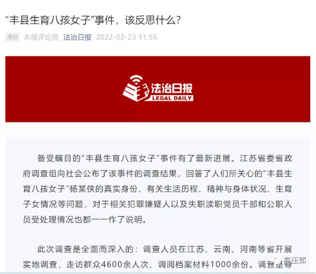 2月23日,江苏省委省政府调查组发布“关于“丰县生育八孩女子”事件调查处理情况的通报。通报发布后,引发网络热议,舆情被再次点燃。而这一次,官媒、特别是央媒没再缺席,而是积极介入报道。