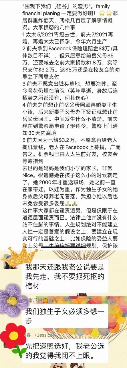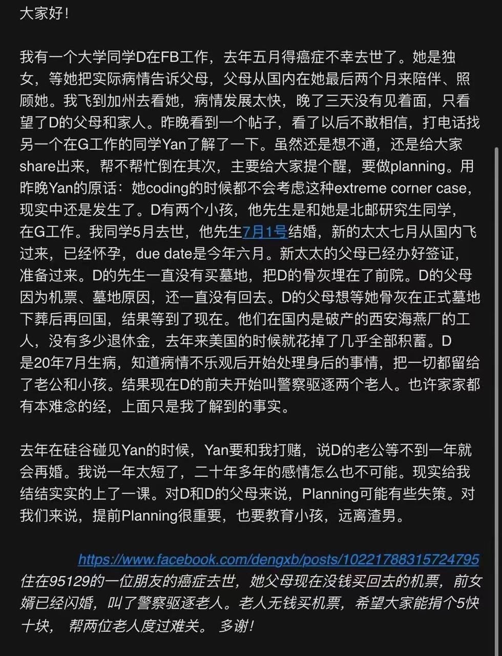 另外有网友发了长贴曝光更多细节。这名网友称自己就是“硅谷渣男”的邻居,认识去世的妈妈,是个很NICE的人,2000年才重返职场,两人的孩子还很小。这位女婿从妻子的公司脸书拿到了金额不详的保险理赔金,只愿意给岳父母5万美元,还减去之前大家捐款的1.8万美元,实际只支付了3.2万美元,这还是在校友会的劝导下同意的。女婿不愿意出钱买墓地,要海葬,至今只能埋在前院。这名女婿再婚后想让岳父母帮忙照顾新婚妻子生孩子,后来新婚妻子的父母办好签证,就想让岳父母回国了。