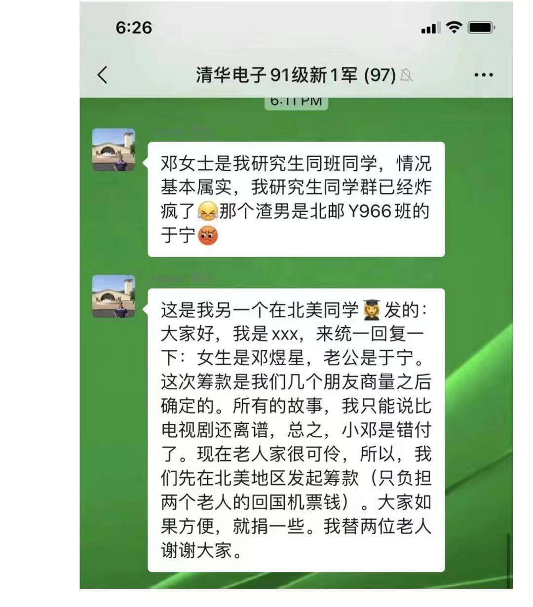 在朋友圈内还流传着一张“清华电子91级新1军”微信群的照片,里面一名网友表示,自己是去世女子的同班同学,他们的研究生同学群已经炸疯了,并且爆出了渣男的信息。网友表示:“所有的故事,我只能说比电视剧还离谱,总之,小邓是错付了。现在老人家很可怜,所以我们现在北美地区发起筹款。”
