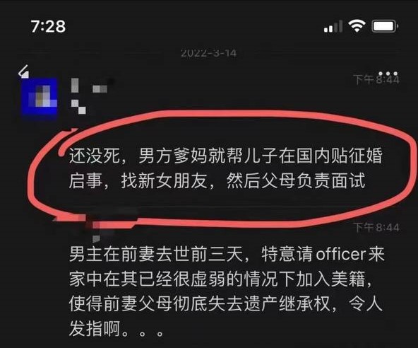 网上还流传着网友爆料,这名女婿在老婆还没去世的情况下,就让自己的爹妈在国内帖征婚启事,找新女朋友,然后父母负责面试。但这个消息不知道真假。