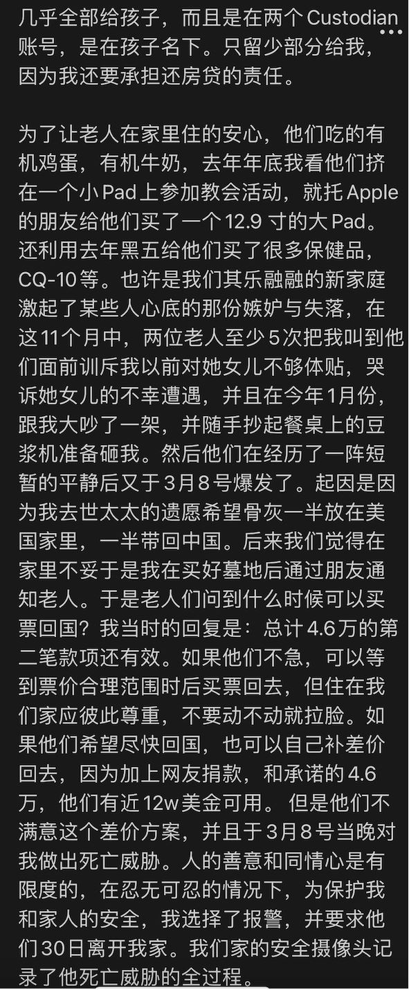 而且这份声明里,没有说到他是否因为妻子得癌去世拿到了保险或fb赔偿的200万美金。如果得到200万美金cash是事实,还不愿意给老人买商务舱,是不是有点过分?拿了200万,在两个老人各种吵各种争取之下,最终只给10万。现在疫情,机票飞涨,回国还有长达数周的隔离,他给两位老人的预算是每人3千美金。这难道不过分?现在机票9千都不一定能买到吧