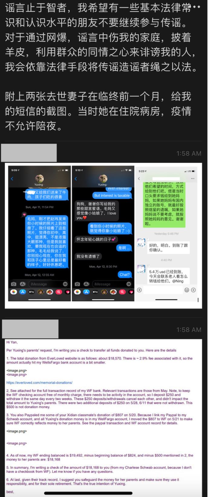 5 前夫因为已给$3.2万,不愿意再给老人掏机票钱。老人在Facebook上募捐,广而告之。机票钱已由太太生前好友,校友会等筹措到。
