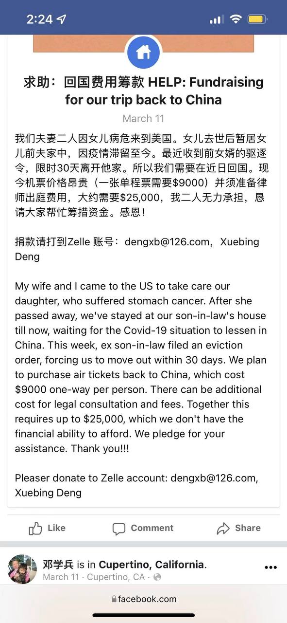 求助:回国费用筹款 HELP:fundraising for our trip back to china 我们夫妻二人因女儿病危来到美国。女儿去世后暂居女儿前夫家中,因疫情滞留至今。最近收到前女婿的驱逐令,限时30天离开他家。所以我们需要在近日回国。先进机票价格昂贵(一张单程票需要$9000)并须准备律师出庭费用,大约需要$25000,我二人无力承担,恳请大家帮忙筹措资金,感恩!捐款请打到Zelle账号:dengxb@126.com, Xuebing Deng