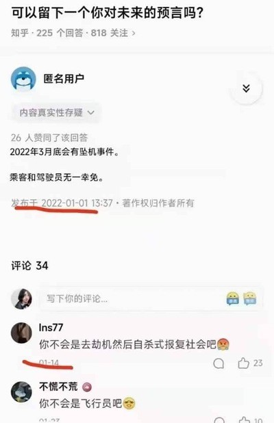 一位网友在2022年1月1日留言说3月底会发生坠机事件,乘客和驾驶员无一幸免。当时有网友提出质疑,“你不会是去劫机然后自杀式报复社会吧?”、“你不会是飞行员吧?”