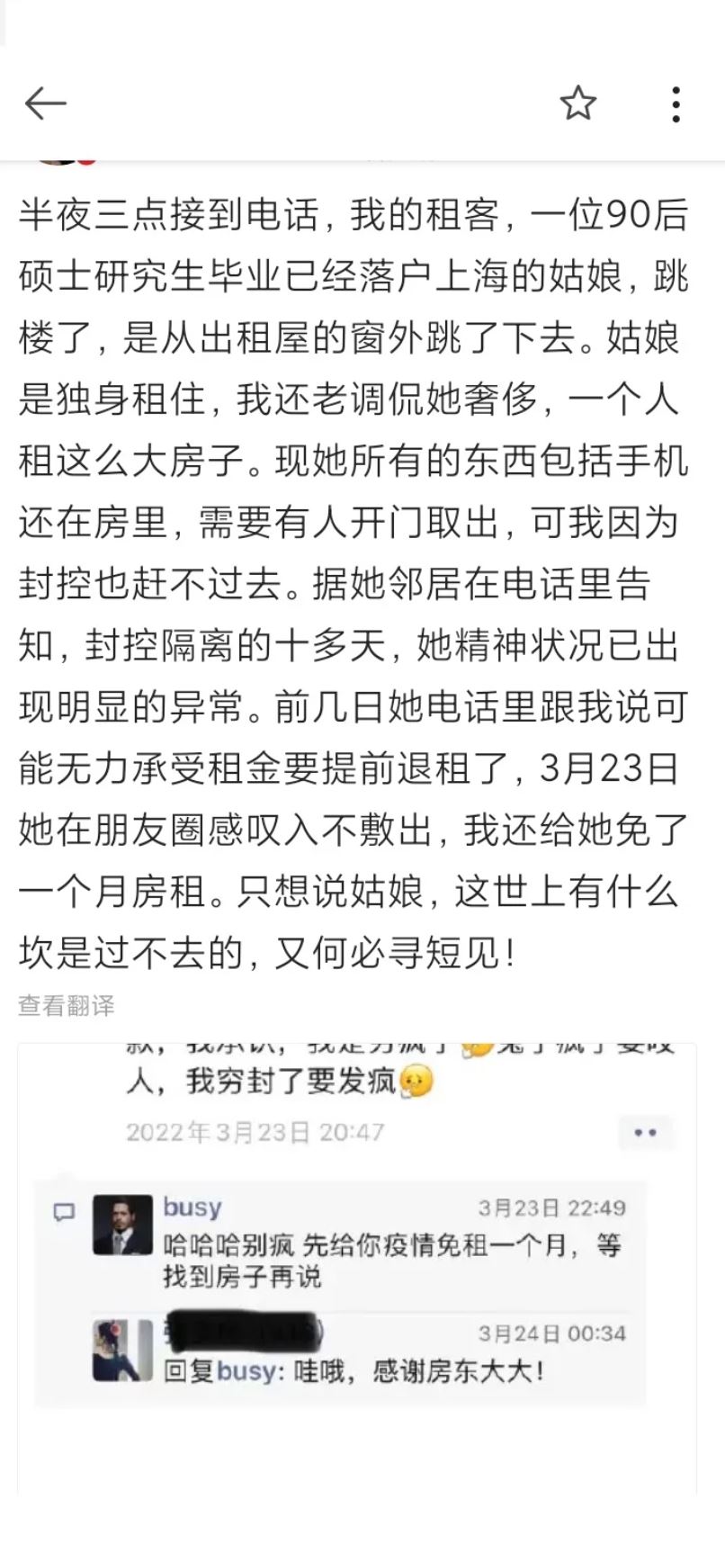 半夜三点接到电话,我的租客,一位90后硕士研究生毕业、已经落户上海的姑娘,跳楼了,是从出租屋的窗户跳了下去。姑娘是独身租住,我还老调侃她奢侈,一个人租那么大房子。现她所有的东西包括手机还在房里。需要有人开门取出,可我因为封控也赶不过去。据她邻居在电话里告知,封控隔离的十多天,她的精神状况已出现明显的异常。前几日她电话里跟我说可能无力承受租金要提前退租了,3月23日她在朋友圈感叹入不敷出,我还给她免了一个月房租。只想说姑娘,这世上有什么坎是过不去的,又何必寻短见!