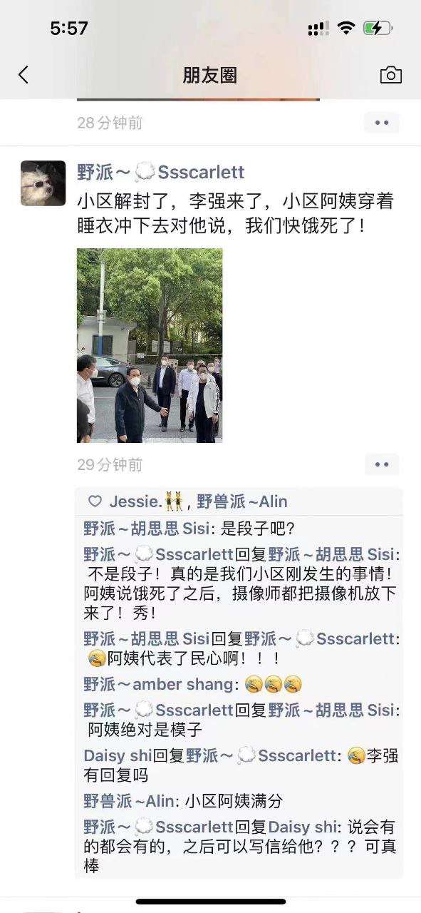 微信朋友圈内有截图传出,称李强当天本计划去一个小区视察,当地官员还安排了“群众演员”,有网友称自己就被安排了,要表现出居民自由自在的美好生活。但李强临时改变主意,到对面小区了解实情。