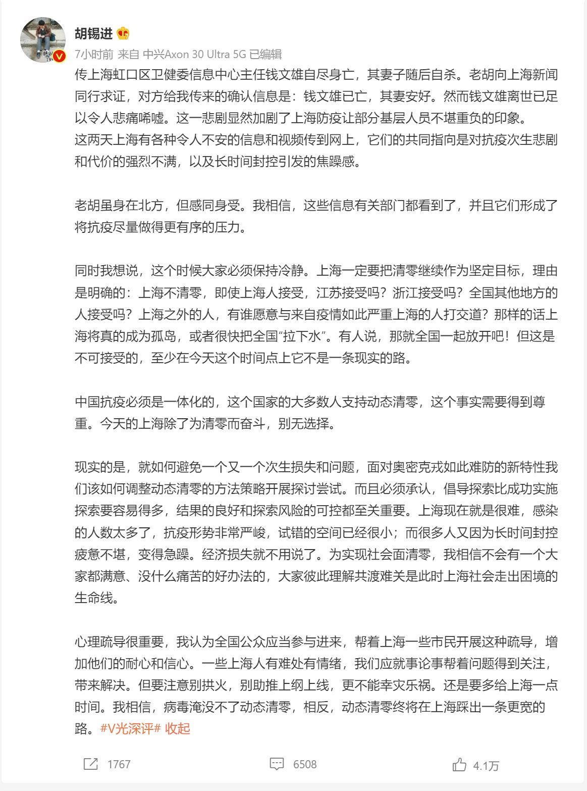 据《时刻新闻》报道,北京时间4月13日,微博上网友“雄韬生”发文,称4月12日网上流传“上海市虹口区卫健委信息中心主任钱文雄当晚在办公室自缢”的消息得到证实,4月13日其家属通过钱文雄朋友圈发讣告。另有消息称,钱文雄患癌症晚期的爱人在送他火化回到家中后,发信息与亲朋好友道别,也自杀了。但最终确认其妻子自杀为谣言。胡锡进也针对此事发文点评。