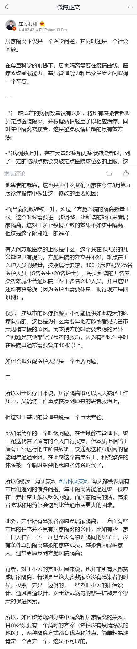 “居家隔离”到底适合不适合中国的国情,西方没有方舱,新加坡和香港也是人口密度较高的亚洲国家,这些发达地区都采用了“居家隔离”模式,中国的上海、广州、北京这样的大都市是否可以借鉴?针对这个问题,庄时利和医生在微博上发表了自己的分析和看法,他写道: