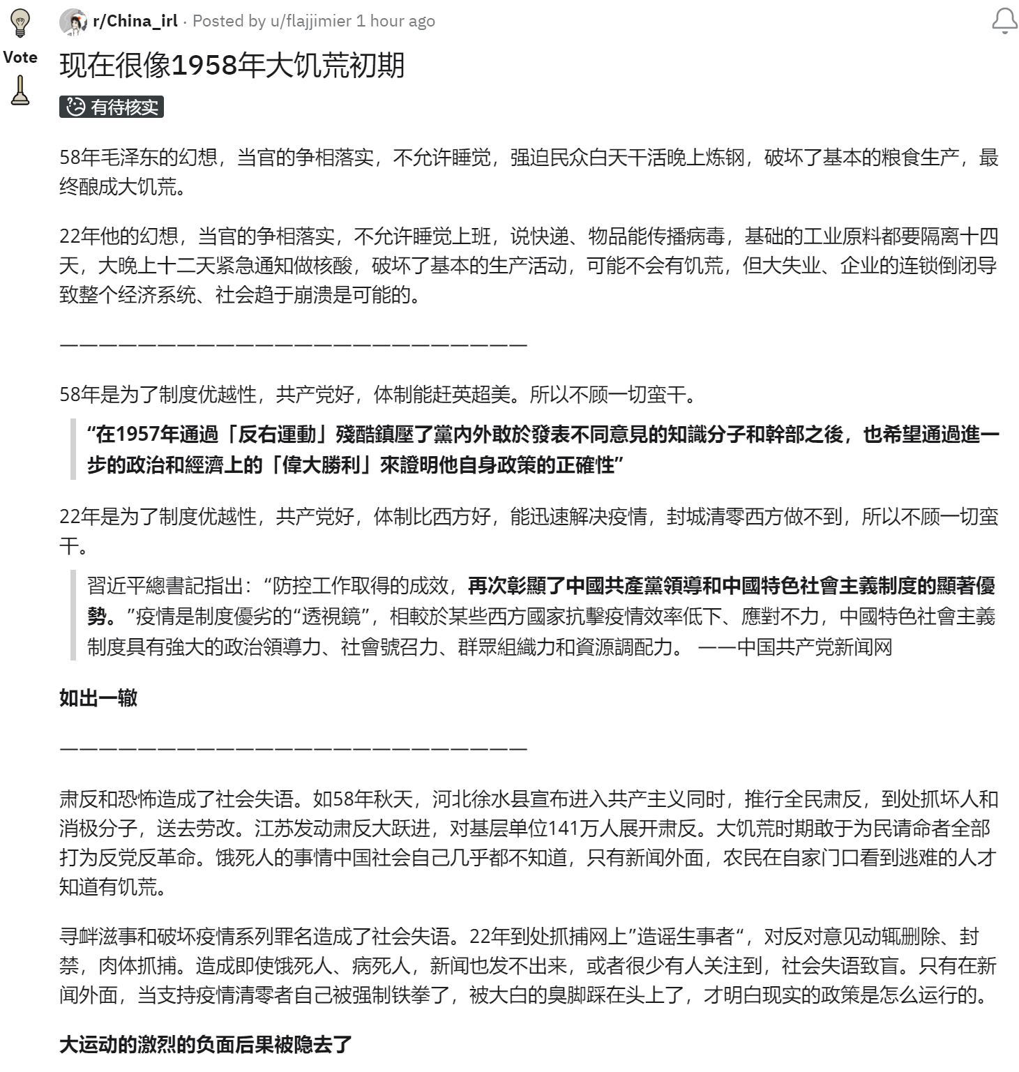 《时刻新闻》报道,4月15日,Reddit上,网友“flajjimier”发表了一篇评论,对比了毛泽东执政的1958年和习近平执政的2022年,感叹现在很像1958年大饥荒初期。