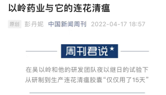 昨天,《中国新闻周刊》则对以岭药业进行深挖,在摘要中就强调,连花清瘟胶囊从研发到生产“仅仅用了15天”;