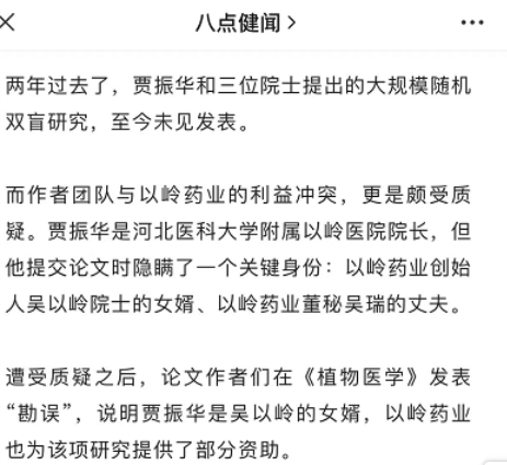 更重要的是,明确指出论文作者团队与以岭药业有利益关联。