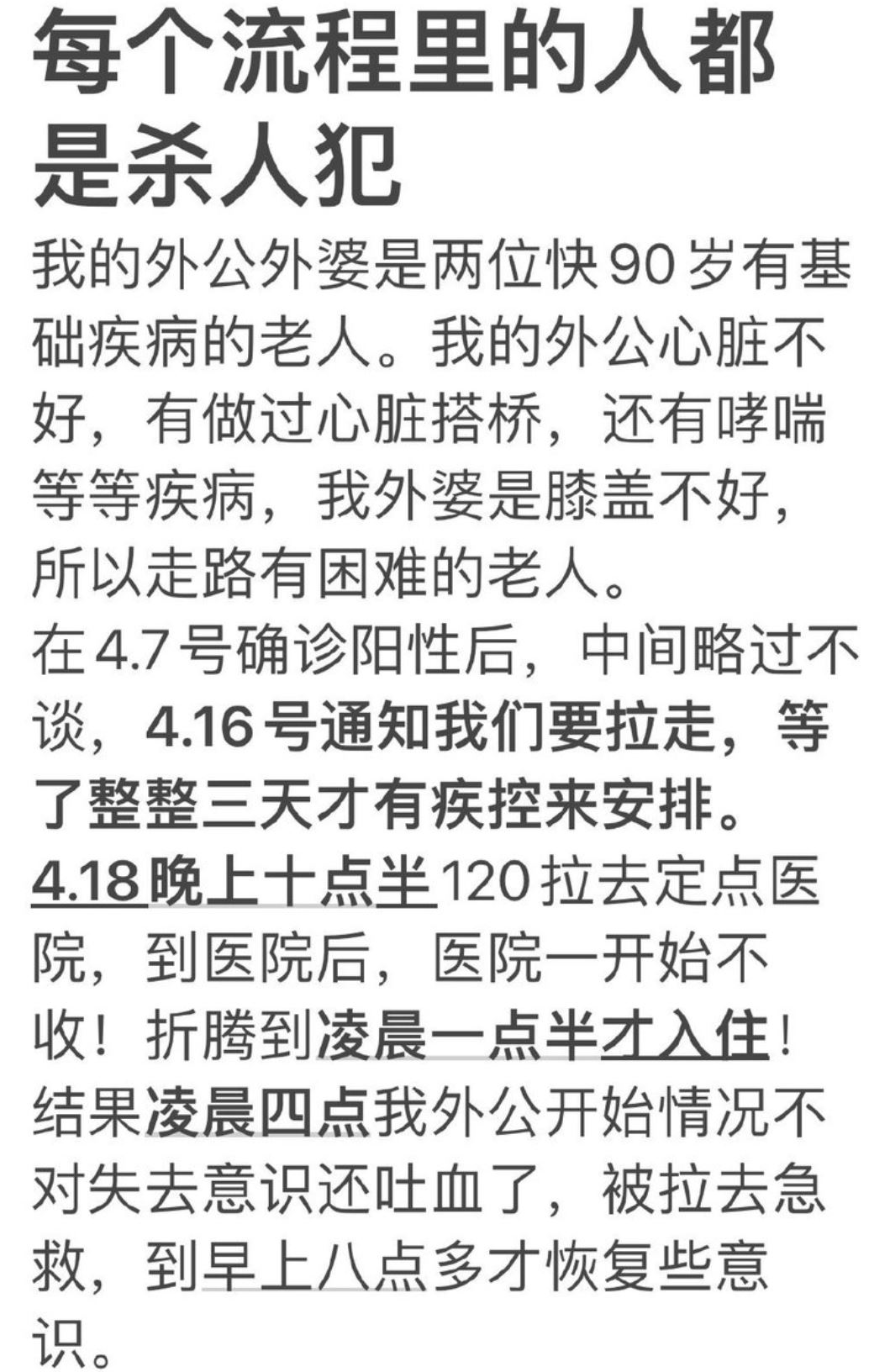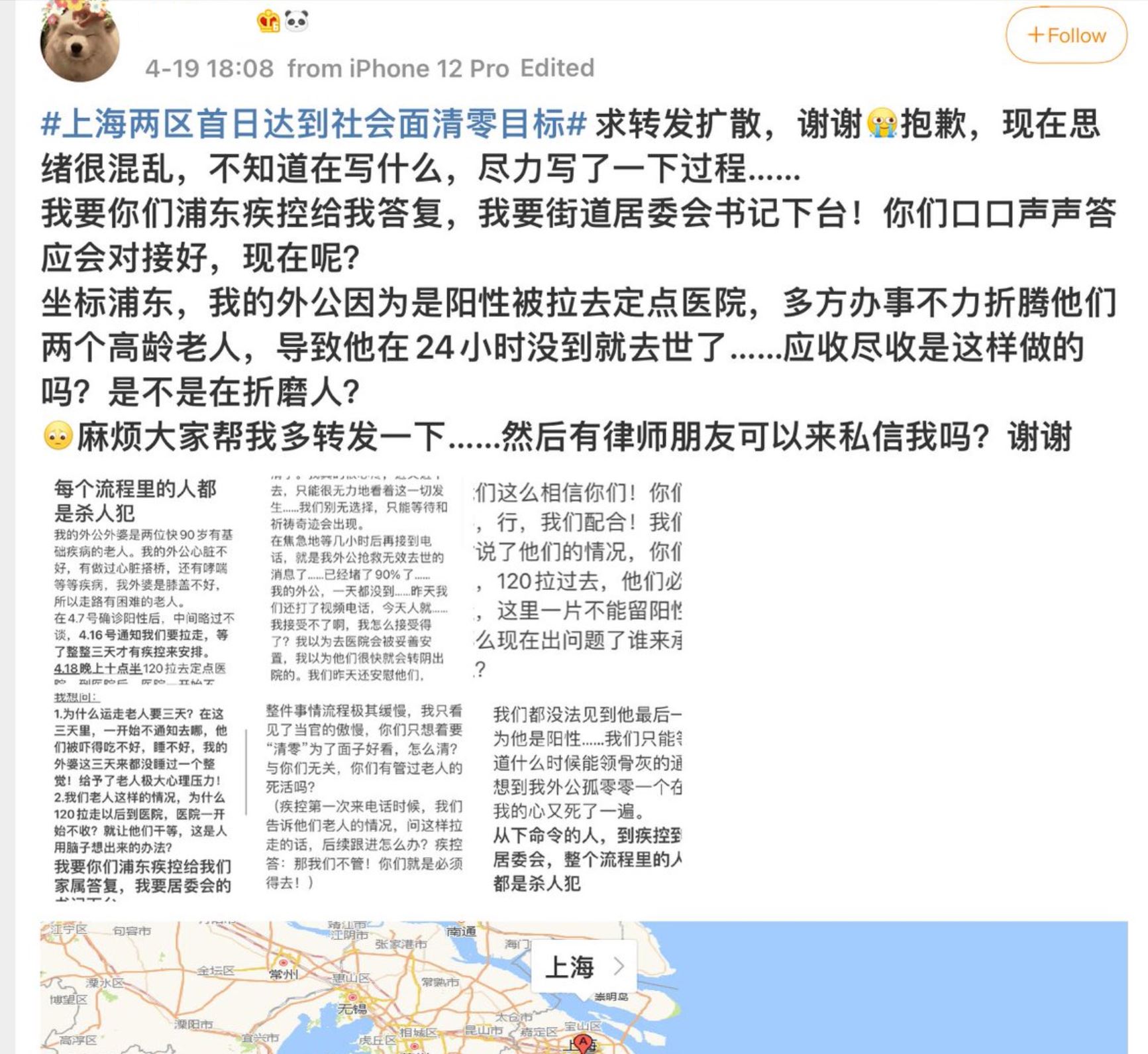 4月19日,一名上海女子在微博发文,要求是上海浦东疾控中心给答复,要求街道居委会书记下台,声讨对接安排她外公救治的所有人,称“每个流程里的人都是杀人犯”。https://t.co/YVieiwXPFu pic.twitter.com/eP6meB74UN