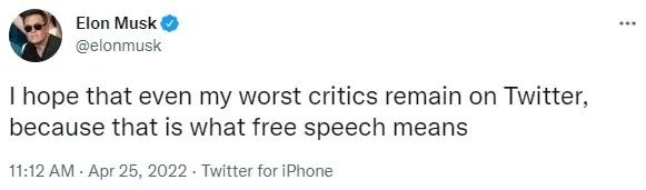马斯克经常表示担心 Twitter 对平台的内容干预过多,在他宣布收购 Twitter 的监管文件中,他写道:“我投资 Twitter 是因为我相信它有潜力成为全球言论自由的平台。”
