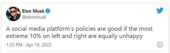 马斯克之前也曾指出过推特过于政治化,他最近在推特上表示,任何社交媒体平台的政策“如果最极端的10%左右的人都不满意,那就是好的”。