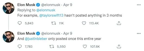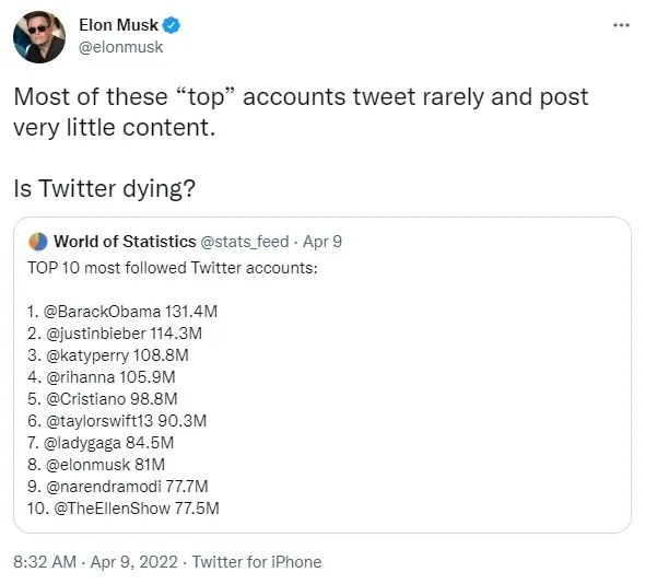 本月,有人统计了10 个最受关注的 Twitter 账户列表,马斯克看到并回应:“这些‘顶级’账户中的大多数人很少发推文,即使发帖发布的实质内容也很少。 推特要死了吗?”