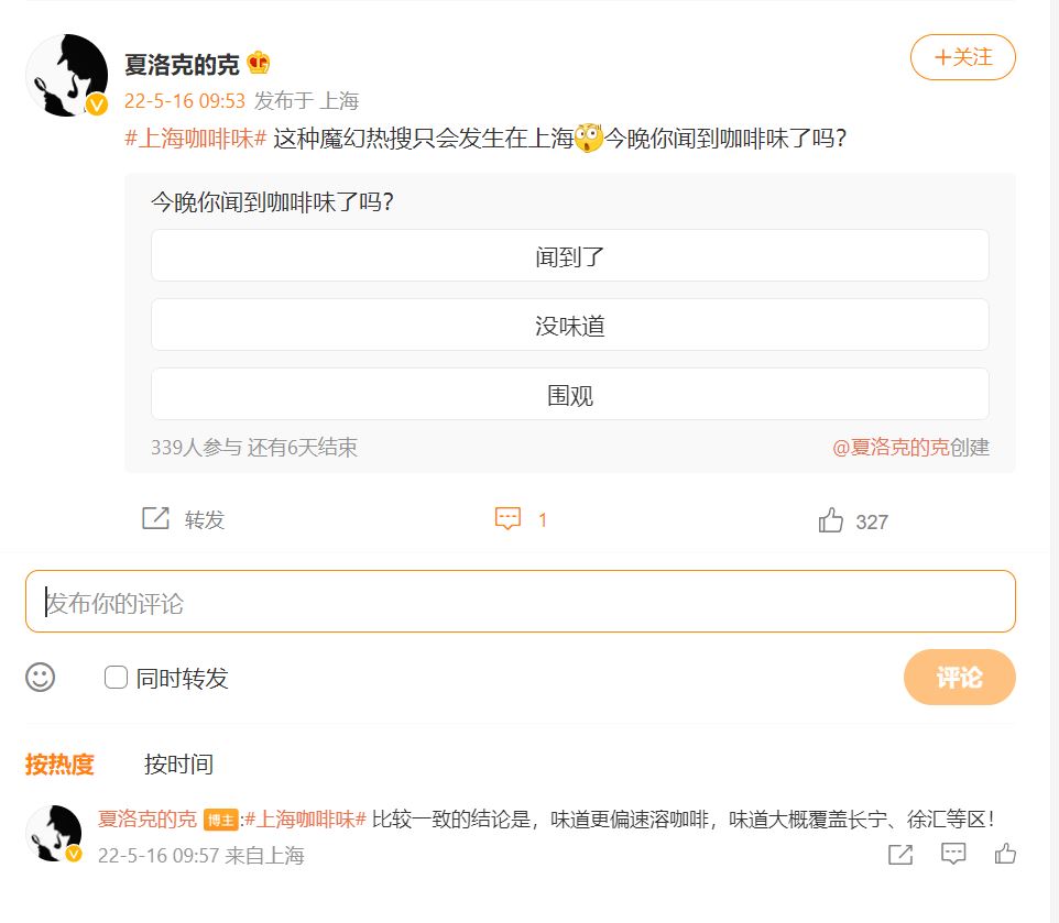 北京时间5月16日晚九点半左右,华东理工大学附近的微博用户爆出来闻到咖啡味,十点左右徐汇、长宁都陆续闻到了咖啡味。网友“夏洛克的克称”:比较一致的结论是,味道更偏速溶咖啡,味道大概覆盖长宁、徐汇等区!