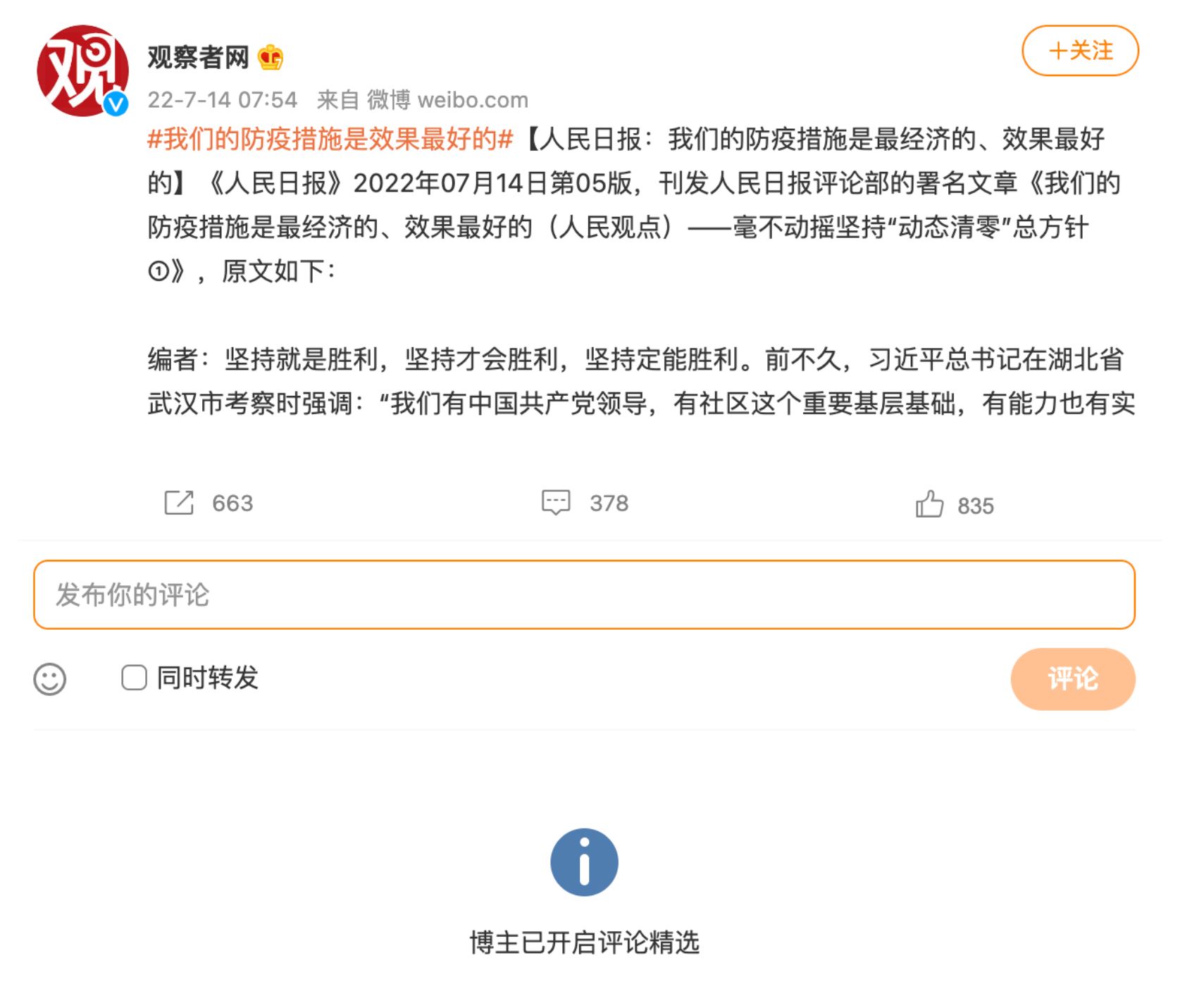 经测试,观察者网、搜狐新闻、等多家官媒的微博账号均已开启“评论精选”。同时,微博限制了话题“#我们的防疫措施是效果最好的”的热度,进行实时搜索仅显示3条相关评论。https://t.co/uuUxaiiTPO pic.twitter.com/Qblfgg6TRu