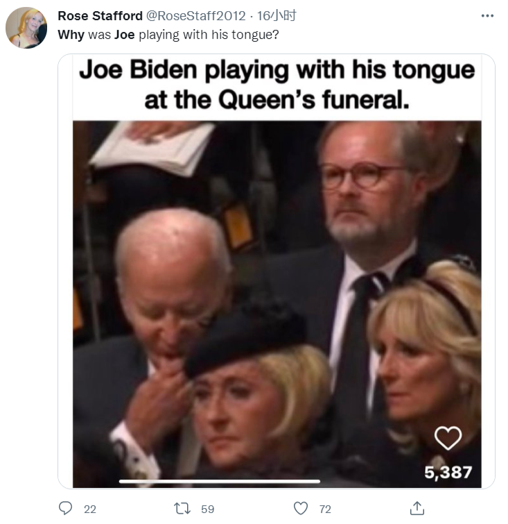 拜登在 参加女王葬礼时,玩起了舌头? (相信可能,有异物不小心跑到了嘴里去!)
