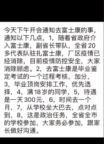 网友投稿河南各地开始协助郑州富士康招工,同时亦有学校通知称,全省的学校都将安排学生进富士康顶岗,这是毕业考核的一部分。 pic.twitter.com/sur9rRSlCd