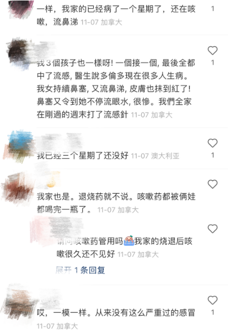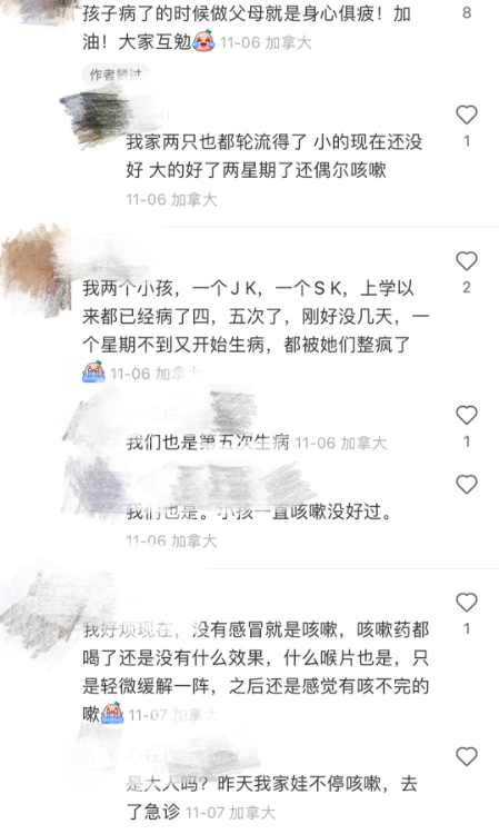 从该博主帖子下面的留言可以看到,很多华人家长都表示孩子得病,父母和孩子都跟着一起受罪!恢复起来的周期也比较长,有些表示三个星期了,还在咳嗽,真的太折磨人了!