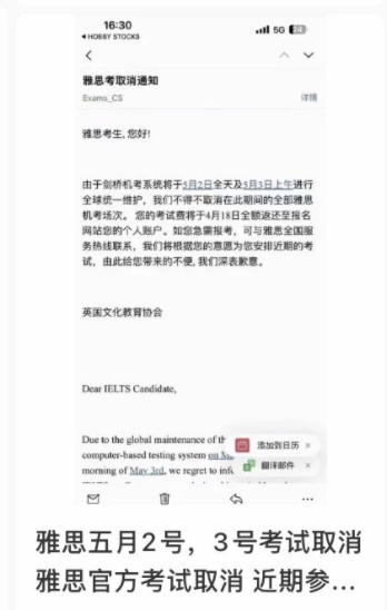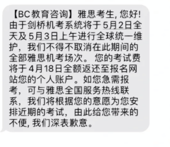 雅思考生,您好!由于剑桥机考系统将于5月2日全天及5月3日上午进行全球统一维护,我们不得不取消在此期间的全部雅思机考场次。您的考试费将于4月18日全额返还至报名网站您的个人账户。
